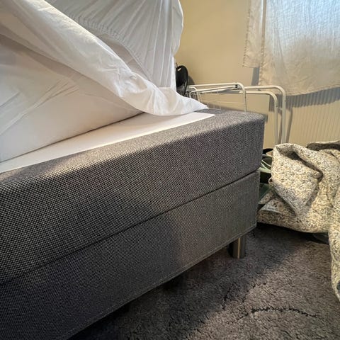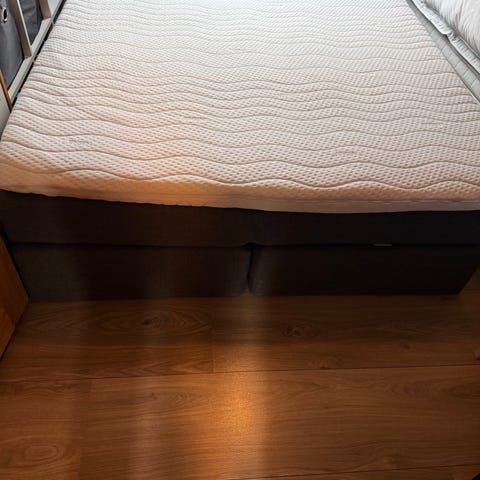 Kontinentali-lignende dobbeltseng 180x200 med to 90 cm madrasser av ulike fasthet (IKEA Hidrasund) og solid understell i tre/stoff.
