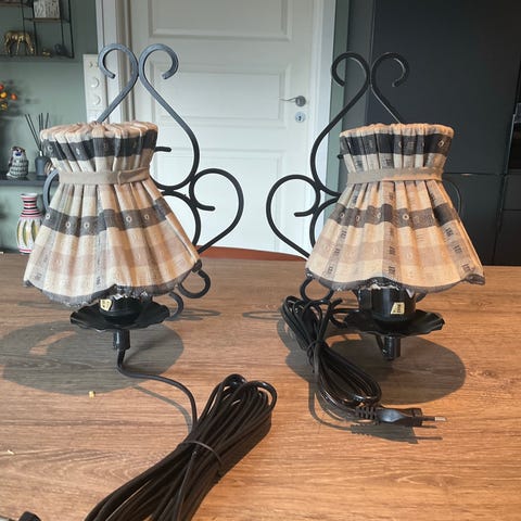 To smijernslamper til vegg selges. En med en pære, og en med to. Fine, matchende skjermer på begge lampene. E27 sokkel.