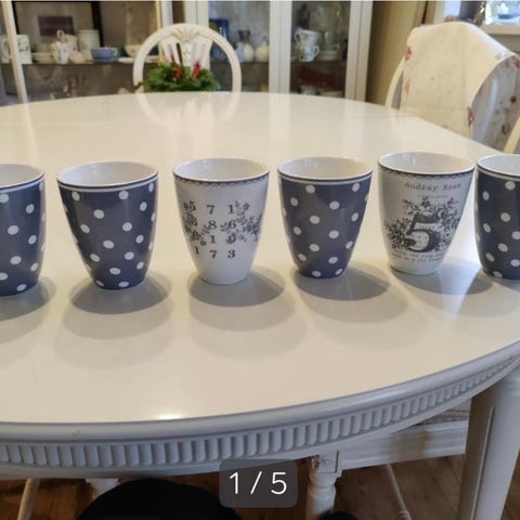 GreenGate kopper i hvit porselen/fajanse med grått trykk og tallmotiv. Settet består av fire like kopper med dekorativ skrift og mønster rundt. Egner seg til servering av varme eller kalde drikker.