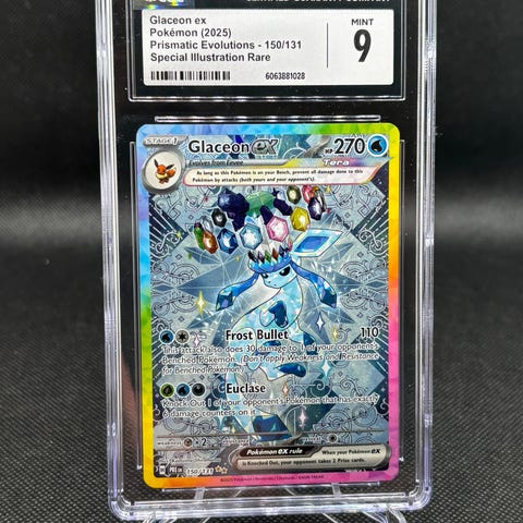 pokemon kort Glaceon GX (secret rare) fra ultra prism. Den har synlige whiting bak og lit synlige skader foran hvis du ser nøye men centering er veldig bra derfor sier jeg at den er MP moderately played se mine andre anonnser får flere kule pokemon hits