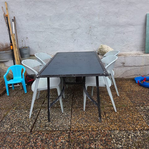 Solid bygget hagebord og to benker gis bort mot henting. Møblene er satt igjen av tidligere eier, og alder er ukjent. De har sannsynligvis stått ute i mange år.