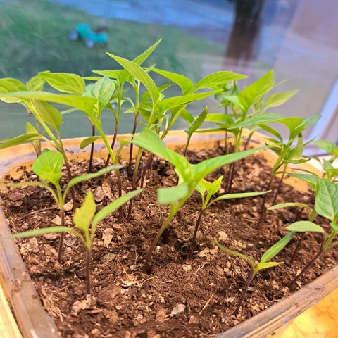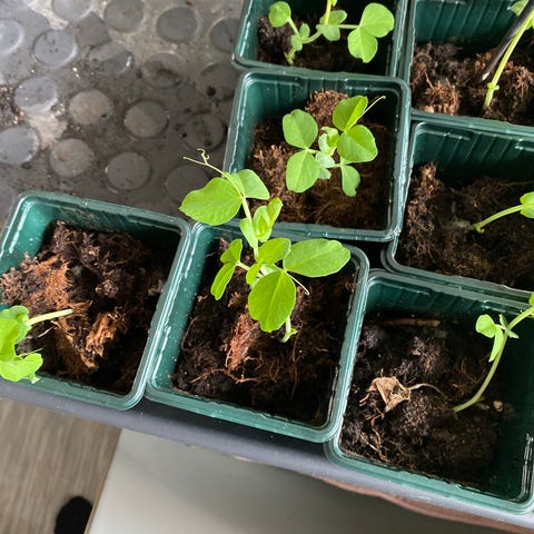 Dahlia småplanter i potte med grønne blader. Plantene står i plastpotter med jord og er egnet for videre dyrking i hage eller større krukker. Kan plantes ut når temperaturen tillater det og trives på et lyst og solrikt sted med jevn vanning. Passer som prydbedplante eller i blomsterkasser utendørs.