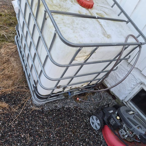 Den ene siden har med tiden fått mye jord oppover veggen da det står i bakke. Den er usikkert hvordan det ser ut når huset tas frem.