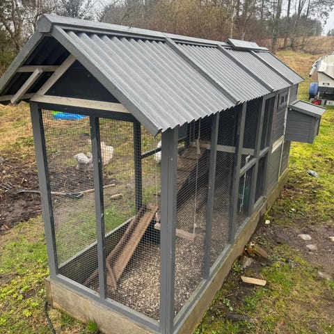 Hønsehus som passer til ca 6-8 mellomstor høns. Det er isolert, har vindu og kasse/gang som vindfang og luke som kan åpnes og lukkes, så det er lunt og godt. Det er to verpekasser og vaglepinner i taket. Det er ikke vasket, men har gulvbelegg og baderomsplater så det er greit å rengjøre.