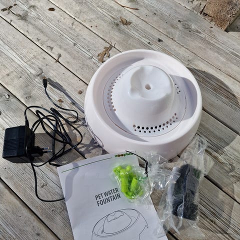 Fontenen har en liten tut som gir rennende vann ned i skålen. Den består av en hovedenhet med vannbeholder og skål, samt avtakbare deler for enkel rengjøring. Det følger med strømadapter for tilkobling til stikkontakt.