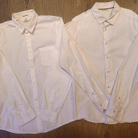 En lyseblå penskjorte strl 158 og en denimskjorte i linblandning 164 ( lmer som 158 i størrelse). Begge i veldig fin stand, trenger kun en runde med strykejernet.