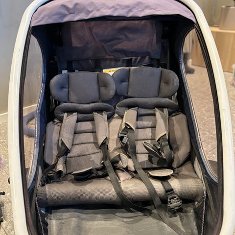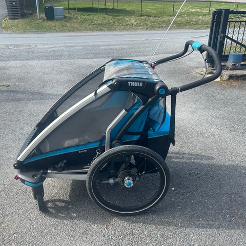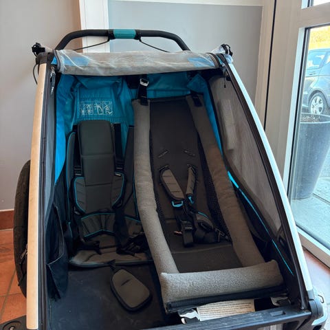 Thule dobbel sykkelvogn i blått med plass til to barn. Vognen har to separate sitteplasser med justerbare 5-punkts seler. Fronten har netting for lufting og beskyttelse, og det er stort lasteområde bak for oppbevaring. Store bakhjul gir stabilitet, og det er håndtak bak for trilling når vognen brukes som barnevogn. Kjøpt ny i 2021.