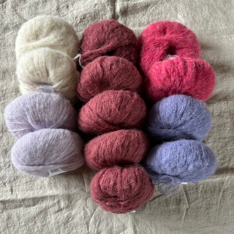 Diverse merker mohair- og silkegarn nøster i ulike farger. Bildene viser flere typer pusete garn, blant annet Kid-Silk, Tynn Silk Mohair og Melody, i ulike nyanser av rosa, blått, grønt, brunt, grått og beige.