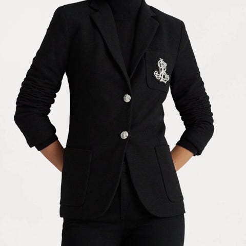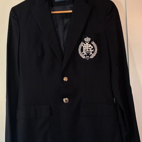 Polo Ralph Lauren blazer for dame i størrelse L. Blazeren er svart og laget i bomull. Den har klassisk krage, knappelukking foran og flere lommer, inkludert brystlomme med brodert PRL-logo. Passer til bruk både til hverdags og mer formelle anledninger.