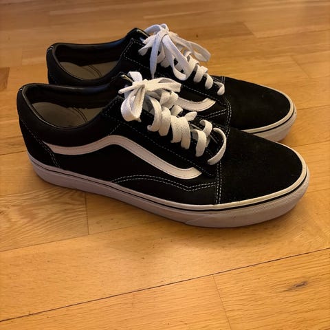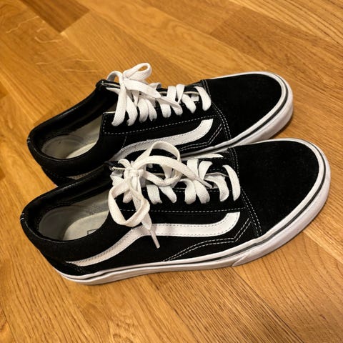 Vans Old Skool sneakers i størrelse 40.5. Klassisk modell med svart overdel og hvite detaljer, inkludert hvit sidestripe og hvite lisser.