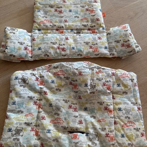 Putesett til Stokke tripp trapp stol selges. Pent brukt med stjernemønster, men er litt revnet i søm på den ene siden hvor man skal feste til setet på barnestolen.