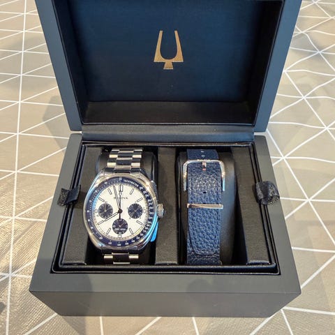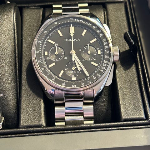 Bulova lunar pilot 43mm stainless steel watch with original bracelet plus an extra Long Island watches tapered bracelet with on the fly adjustment. A huge improvement on the original that had a butterfly clasp.
