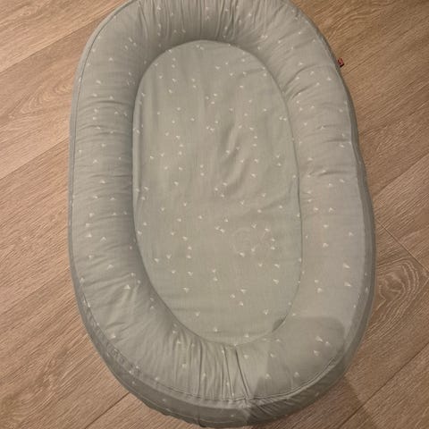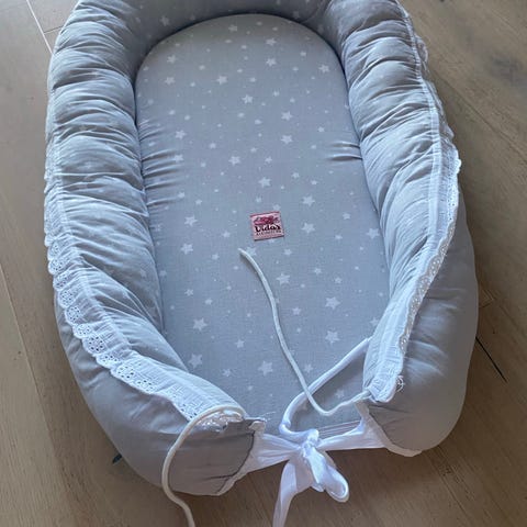 Done by Deer babynest i blå farge med lyst innertrekk og prikkete mønster. Babynestet har myke, polstrede kanter rundt hele liggeflaten og snøring i fotenden for justering av størrelse og fasong. Egnet som trygg og omsluttende liggeplass for baby på sofa, i seng eller på gulv. Ytterstoff og innertrekk i tekstil, fyll i polstret materiale for komfort.