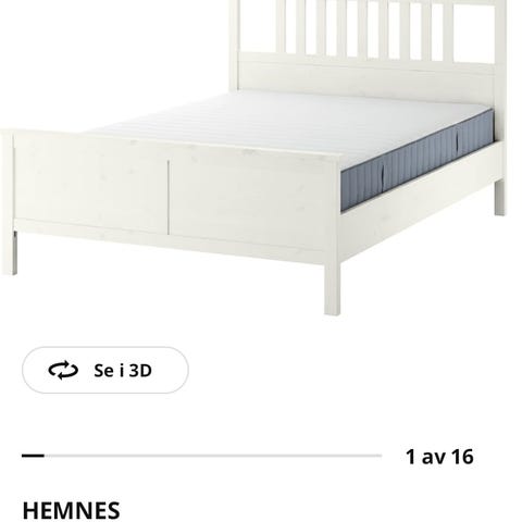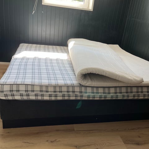 Pent brukt seng med sengebunn og spring-fjærmadrass (to stk på 80 cm bredde). Og fire brede skuffer. Brukt på hytta.