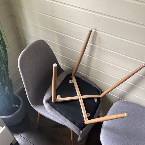 Carl Hansens Sawbuck- stol designet av Hans J. Wegner selges. Klassisk trestol med sete i grå tekstil. Stolen har buet ryggstøtte og skrå ben som gir god sittekomfort.