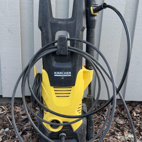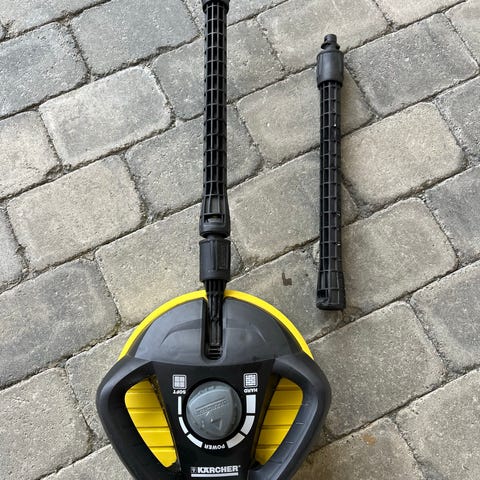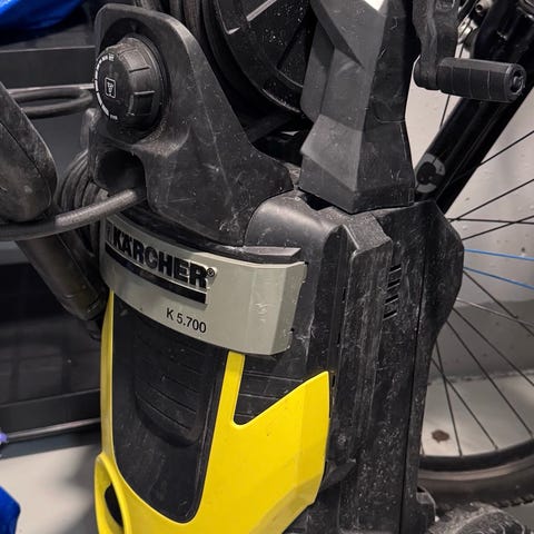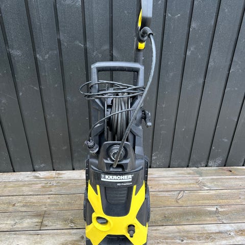 Karcher K5 med slangetrommel og to lanser. Fungerer fint. Har en liten skade på håndtak, men er fortsatt stødig og funksjonell.