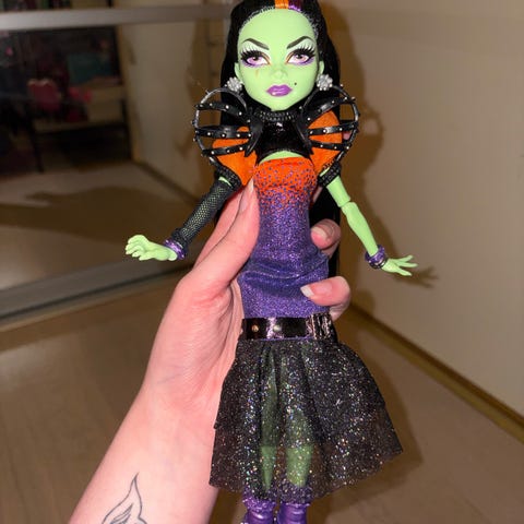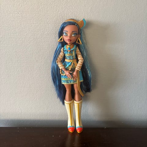 Monster High Cleo De Nile dukke G1. Dukken kommer med nesten alle delene, mangler kun ett lite armbånd. Den er svært lite brukt, stort sett kun som dekorasjon på hyllen. Egnet som leke- og samledukke.