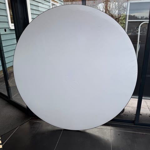 Hvit, sprukket i det ene hjørnet,