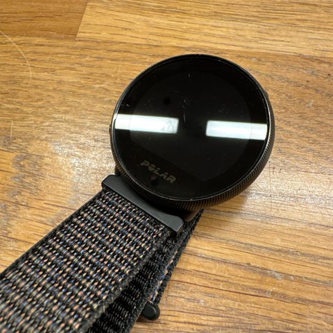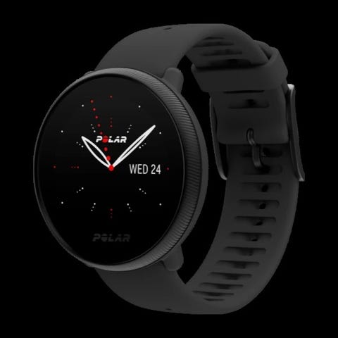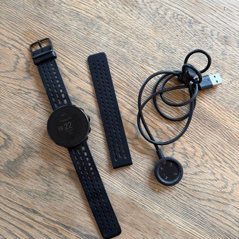 Polar treningsklokke med svart reim og lader. Enkel og stilren klokke med rund skjerm og sporty uttrykk.