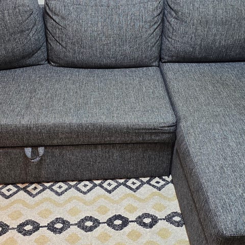 Brun/grå sovesofa med sjeselong som kan åpnes for å oppbevare sengetøy. God både sitte og sove i. Kan brukes som enkelt seng (200 x 72 cm) og dobbel seng ( 200 x 142 cm). Ingen synlige slitemerker.