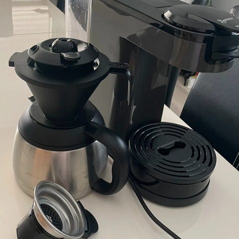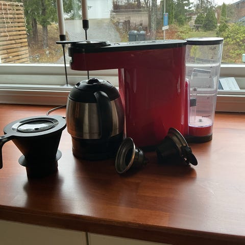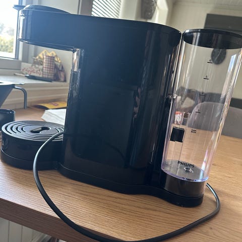Senseo kaffemaskin fra Philips. Kaffemaskinen er en 3-i-1 apparat som leverer alt fra en enkel kopp, et krus til en kanne med nytraktet filterkaffe, alt med ett lite knappetrykk. Den lager både filter- og kapselskaffe. Kan få med noen sjokoladedrikk kapsler + kaffefilter. Maskinen rommer opp til 1 liter kaffe.
