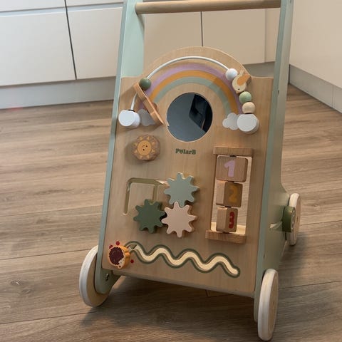 Pent brukt aktivitetsvogn i tre. Brukt av ett barn. Alt fungerer. Se bilder.