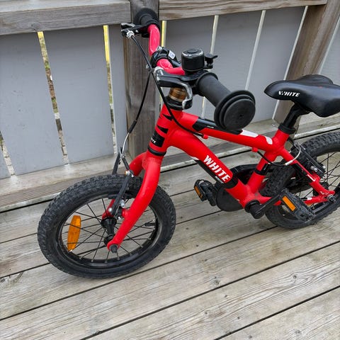 Fungerer som den skal (må fylles luft i dekkene). Den ble oppbevart inne. Litt bruksmerker er det.