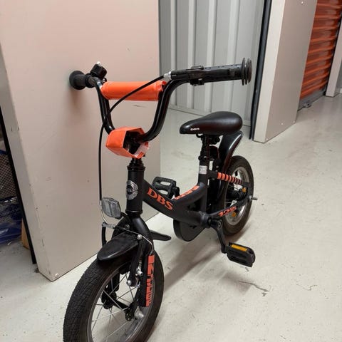 DBS barnesykkel 12" i svart med røde detaljer. Sykkelen har 12-tommers hjul, rett styre med håndbrems foran og støttehjul montert bak. Sete og styre kan justeres i høyden for å passe mindre barn. Egnet som første tråsykkel for barn som skal lære å sykle med støttehjul.