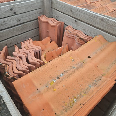 Vi skal pusse opp og går for noe annet enn takstein. Derfor selger vi det gamle. Mener å huske at taksteinen er fra mellom 2012-2014. Steinene er fine men trenger en vask. Steinene er ru og ikke glatte.