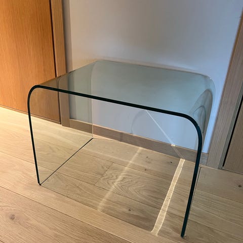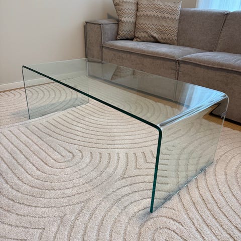 Pent salongbord i herdet glass. Solid og god størrelse, men «tar lite plass». Bordet er i god stand. Beskyttelsen på hjørnene har bruksmerker.