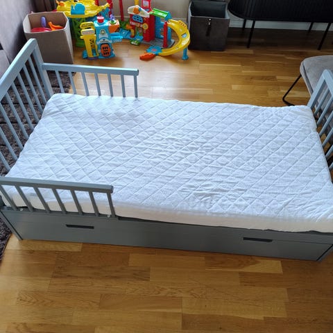 Minitude juniorseng grå. Sengen har en ramme formet som et hus, med åpne sider og takstruktur. Passer til barn som har vokst ut av sprinkelseng og over i juniorsengstørrelse.
