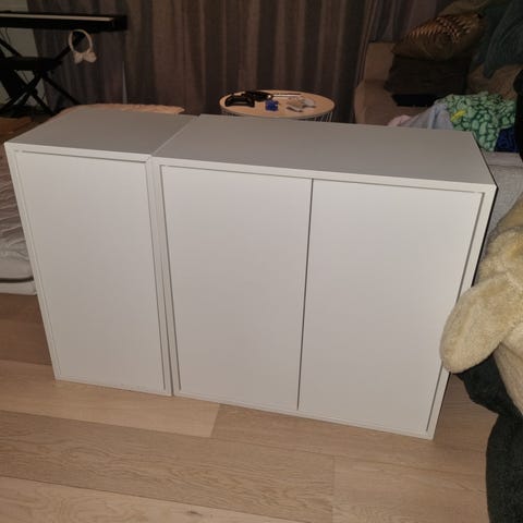 Svært pent brukt hvitbeiset EKET skap med dør, uten bakplate - 35 x 35 x 30 cm - med trykk/åpen funksjon på døren. Ingen skader, fremstår som nytt. Kan være av typen VALJE.