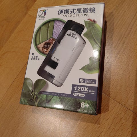 Carson MicroBrite Plus lommemikroskop med forstørrelse fra 60x til 120x og innebygd LED-lys. Mikroskopet drives av 1 AA-batteri (ikke inkludert). Kompakt og lett design som gjør det egnet til bruk hjemme, på skole eller på tur for nærstudier av små objekter og detaljer.