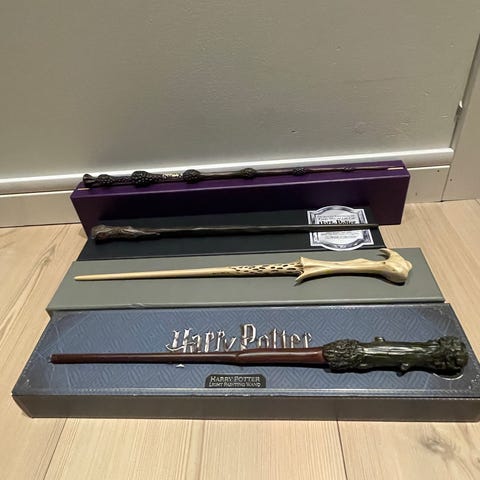 Harry Potter tryllestaver i eske med motivene Harry Potter, Hermione Granger, Neville Longbottom og Albus Dumbledore. Hver tryllestav leveres i egen rektangulær eske i ulike farger med oval etikett på toppen. Esken er merket med navnet på karakteren og teksten «A Recreation of the Famous Wand». Tryllestavene er egnet som samleobjekter eller rekvisitter til kostyme og temabaserte arrangementer.