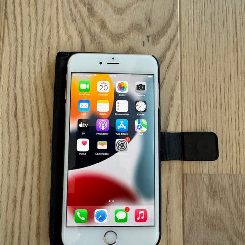 Apple iPhone 8 mobiltelefon med 64 GB lagringskapasitet. Modellen har skjerm med hjem-knapp og Touch ID, kamera med blits på baksiden og frontkamera over skjermen. Telefonen har Lightning-tilkobling for lading og dataoverføring. Bilder viser også et deksel med håndreim og plass til kort, samt ladekabel som kan følge med etter avtale med selger.