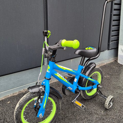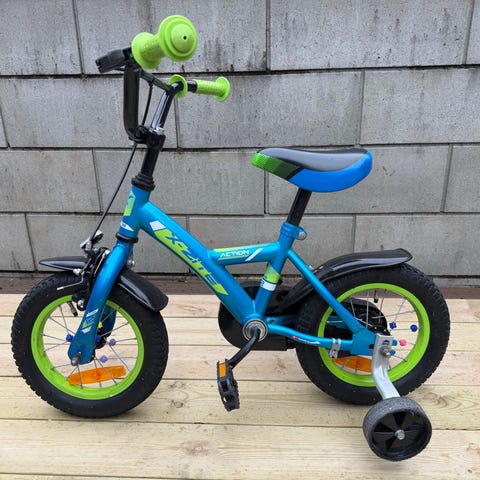 Pent brukt barnesykkel med supporting hjul.