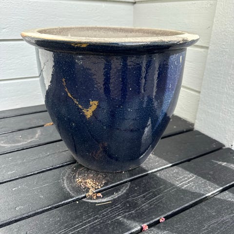 Blomsterpotte i keramikk i mørk blå farge med lyst dekorativt blomstermønster. Potterommet er glasert innvendig og har dreneringshull i bunnen. Det følger med tilhørende fat i samme materiale og farge. Egnet til innendørs eller utendørs bruk, avhengig av klima og plantetype. Passer til mindre busker, blomster eller grønne planter.