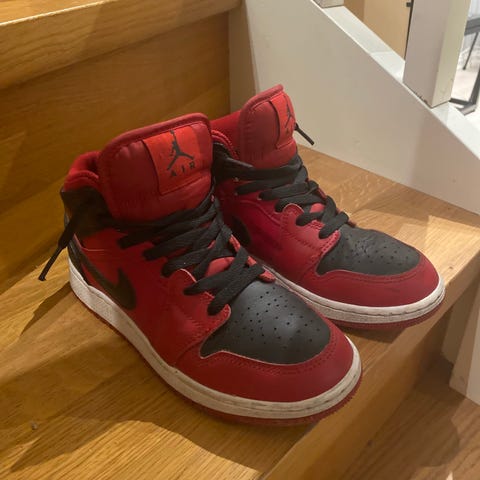 Svært lite brukt Air Jordan 1 Mid (GS) sko som min sønn på 12 år kjøpte i fjor i Orlando. Størrelsen er 39. Brukt kun til pent (ikke på skolen). Farge er black/white gym red. Har original eske, klistremerke og kvittering.