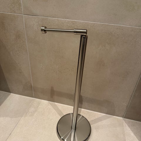 -Sett med dobbelt håndklestativ/tverrstang til håndklær b=53 cm, veggmontert dorullholder og 2 knagger i børstet stål -samme serie og med festeskruer. 400 for hele settet.