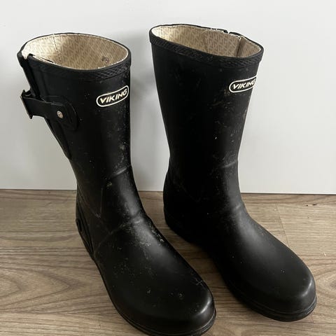 Lite brukte Viking gummistøvler for barn i størrelse 33, unisex. Støvlene har mørk bunnfarge med motiv og kraftig såle med mønster for bedre grep. Egnet til bruk i regnvær, i barnehage eller på tur der det er vått og sølete. Laget i vanntett og kjempe god kvalitet materiale som holder føttene tørre.Ingen skader.