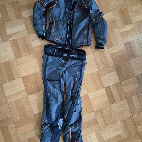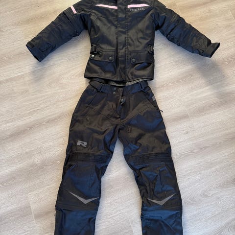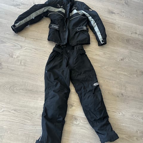 Bullfighter motorsykkelsett bestående av jakke og bukse i størrelse L. Sett i svart tekstil med avtakbar innerfôr i jakken. Jakken har justeringsmuligheter på ermer og midje, samt glidelås for sammenkobling med buksen. Buksen har forsterkede felt på knær og seteområde, samt seler for bedre passform. Egnet som kjøreutstyr til motorsykkel med fokus på komfort og praktiske løsninger under kjøring. (AI generert)