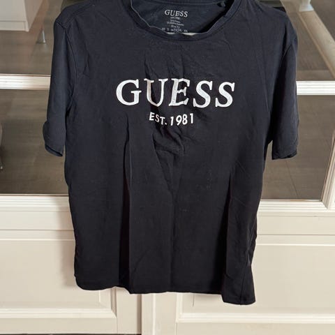 T-skjorten er svart og laget av bomull. Modellen har rund hals og kort erm. Fronten har trykket Guess-logo med teksten "Los Angeles" og tynne kontrastlinjer. Baksiden er ensfarget uten trykk. Passer som hverdagsplagg eller til enkel, casual bruk.