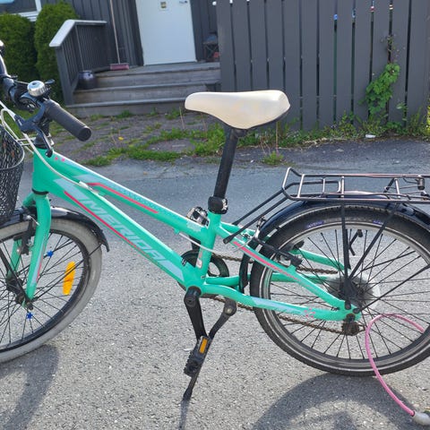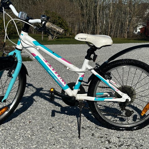 Barnesykkel med 20" hjul i hvit farge med gule detaljer. Sykkelen har dempegaffel foran, skjermer foran og bak, samt felgbremser. Passer til barn som trenger en sykkel med 20-tommers hjul til bruk på vei og lette grusunderlag.