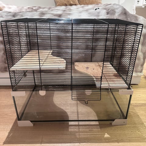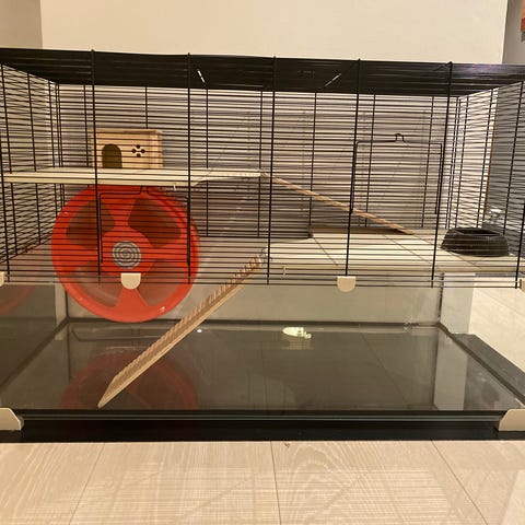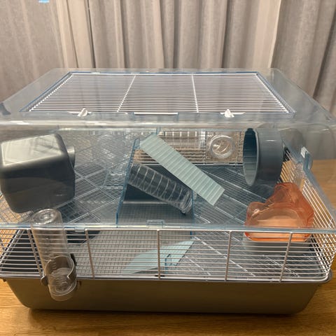 Smådyrbur i glass med metallgitter på toppen. Buret har flere nivåer med rampe, hus og hjul til smådyr. Det følger med masse diverse tilbehør som transportboks i plast, leker, vannflaske og gjemmesteder. Egnet for små gnagere som for eksempel hamster eller mus, avhengig av artens plassbehov og anbefalinger. Buret gir mulighet for dyp bunn med strø og god oversikt gjennom glassveggene.