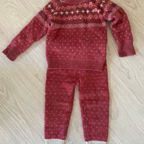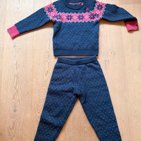 Jotunheim ullsett for barn i størrelse 92. Sett i blå ull bestående av genser og bukse, med kontrastdetaljer og mønster. Unisex-modell som egner seg som innerste lag eller mellomlag på kjølige dager.