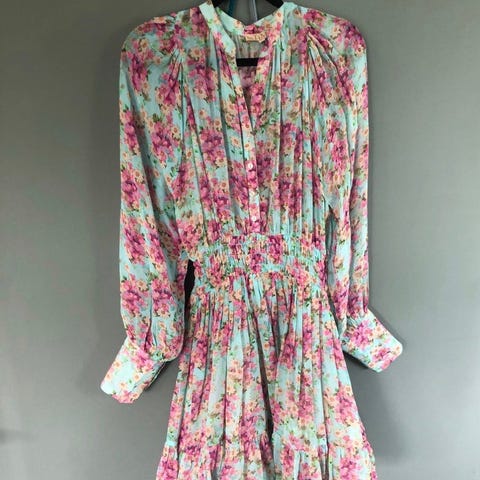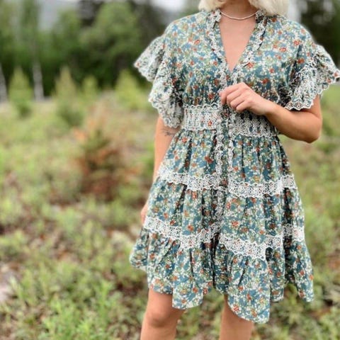 byTiMo sommerkjole for dame i størrelse S. Kjolen er laget i viskose og har et flerfarget blomstermønster med grønn bunnfarge. Modellen har lange ermer med volum, v-utringning og krage. Fronten har rynkedetaljer og knappelukking, og skjørtet er lett utsvingt med volangkant. Passer som lett kjole til vår- og sommerbruk.