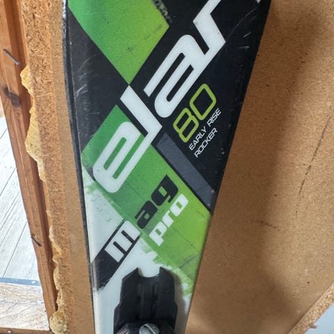 Salomon alpinski med binding. Skiene har integrerte bindinger som kan justeres til passende støvellengde.