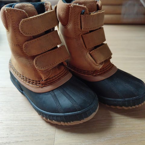 Sorel barnesko i størrelse 26. Skoene har brun overdel med svart tåparti og lys såle. Modellen har borrelåslukking over vristen og drahempe bak for enklere av- og påkledning. Overdelen er i et semsket lignende materiale kombinert med et mer slitesterkt materiale foran. Vanntett. Yttersålen er i gummi med mønster for bedre grep. Egnet som hverdags- og utesko for barn.