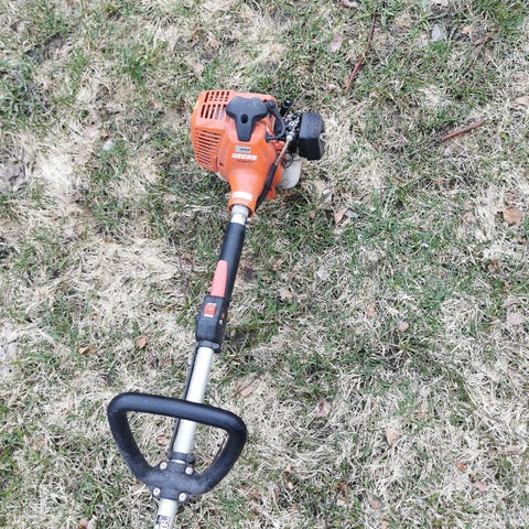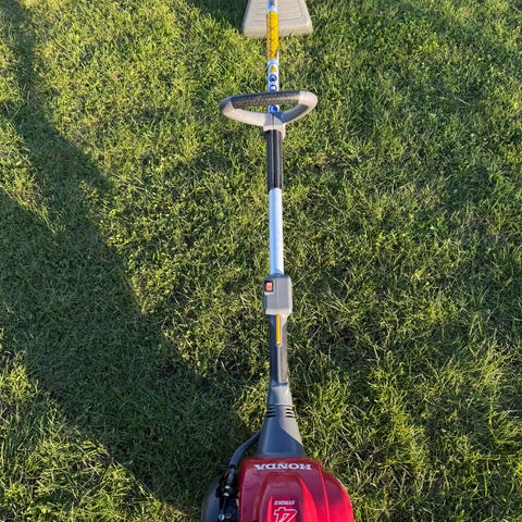 Bensindrevet gresstrimmer i blå farge. Trimmeren har langt skaft med tohåndsgrep og beskyttelsesdeksel rundt trimmerhodet. Egnet for klipping og kanttrimming av gress og ugress i hage og langs kanter. Drives av motorenhet montert øverst på skaftet. Passer til vanlig hagebruk der det er behov for lettere vedlikehold av plen og bedkanter.