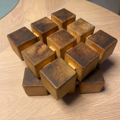 Underlaget består av flere bevegelige trestaver som kan foldes ut til et rundt gryteunderlag for varme kjeler, panner eller fat, og foldes sammen til en kompakt form når det ikke er i bruk. Når det er sammenfoldet, står det på en rund sokkel og fungerer også som et dekorativt element på kjøkkenbenken eller spisebordet.